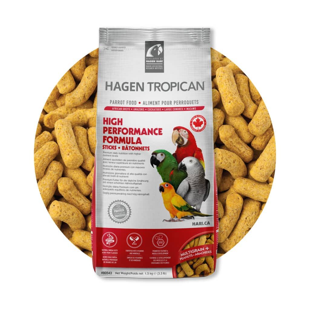 Tropican High Performance Formula e подходящ избор за ежедневно хранене на папагали преди отбиване, подрастващи и/или двойки за размножаване, както и за папагали, изложени на среда, изискваща по-висока калорийна храна (големи волиери с достатъчно пространство за летене ) и по-обилна диета. Създаден за максимален вкус, той е формулиран на базата на естествени плодови аромати като портокал и банан и разнообразие от 8 вида зърнени храни и ядки. Богат източник на омега мастни киселини от ленено семе, фъстъци и слънчогледови семки кара перата да блестят и помагат за поддържането на здраво тяло. Тъй като Tropican включва витамини и минерали, а също и пребиотични фибри, не е необходима витаминна добавка.